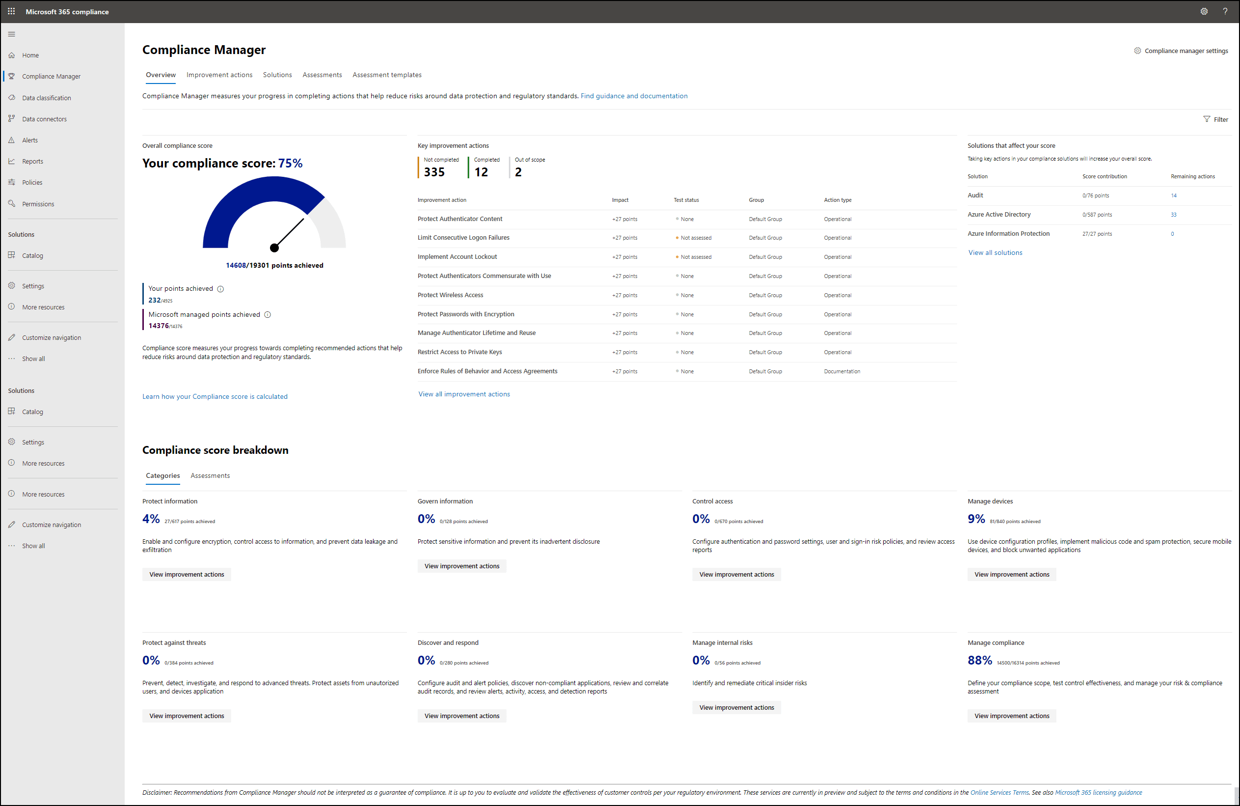 Microsoft Compliance Manager is a feature in the Microsoft 365 compliance centre that helps you manage your organization’s compliance requirements with greater ease and convenience. Compliance Manager can help you throughout your compliance journey, from taking inventory of your data protection risks to managing the complexities of implementing controls, staying current with regulations and certifications, and reporting to auditors.