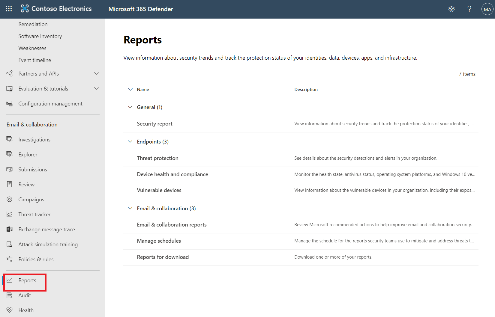 The Microsoft Defender portal includes a Reports section that includes a general security report, reports related to endpoints, and reports related to email and collaboration.