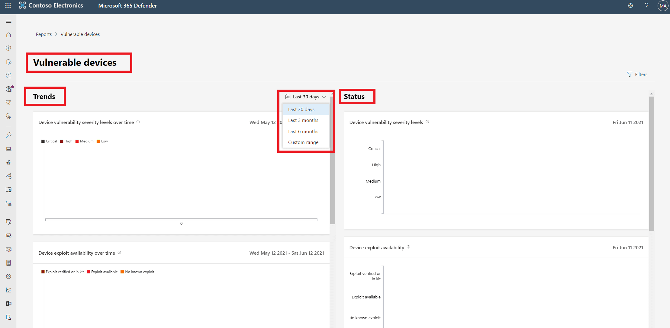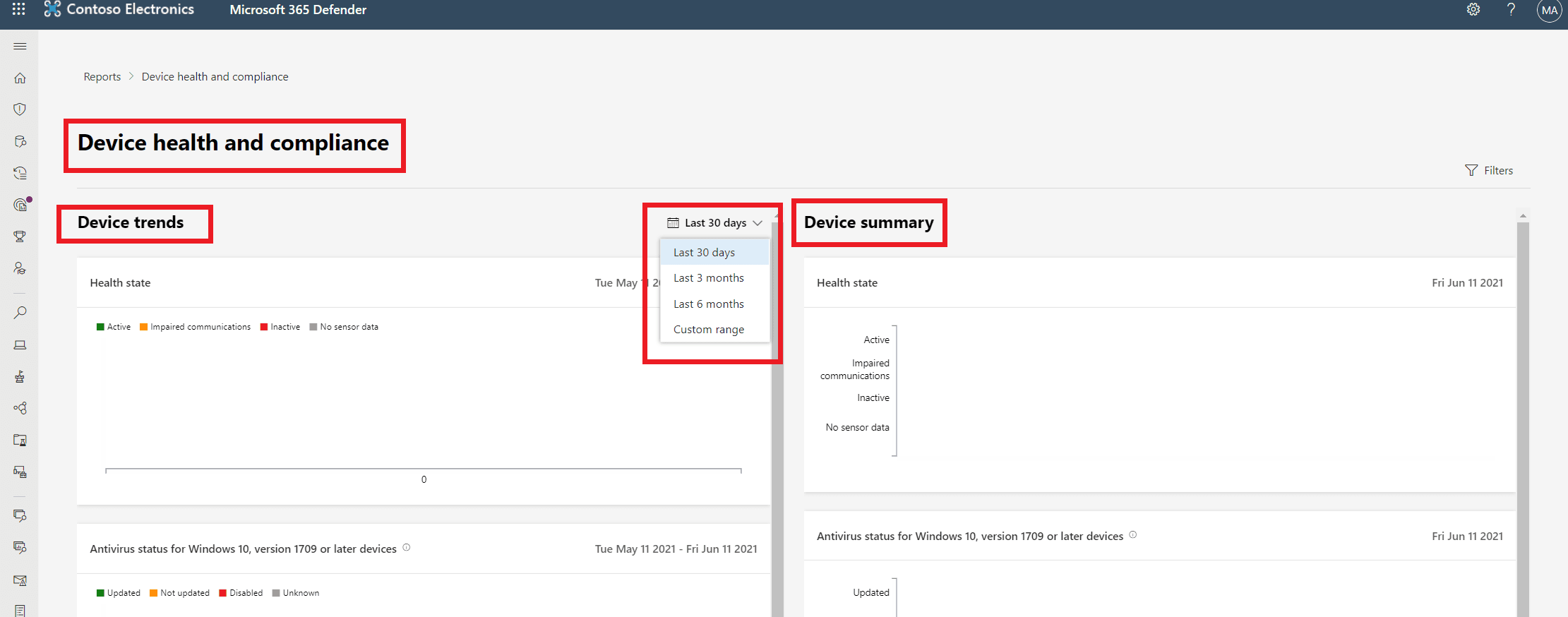 Device trends - By default, the device trends displays device information from the 30-day period ending in the latest full day. To gain better perspective on trends occurring in your organization, you can fine-tune the reporting period by adjusting the time period.