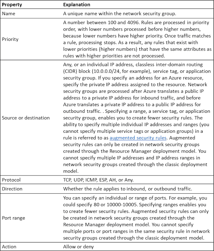 A network security group contains zero, or as many rules as desired, within Azure subscription limits. Each rule specifies the following properties: