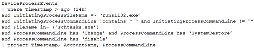 You need to receive an alert when any process disables System Restore on a device managed by Microsoft Defender during the last 24 hours. Which two actions should you perform?